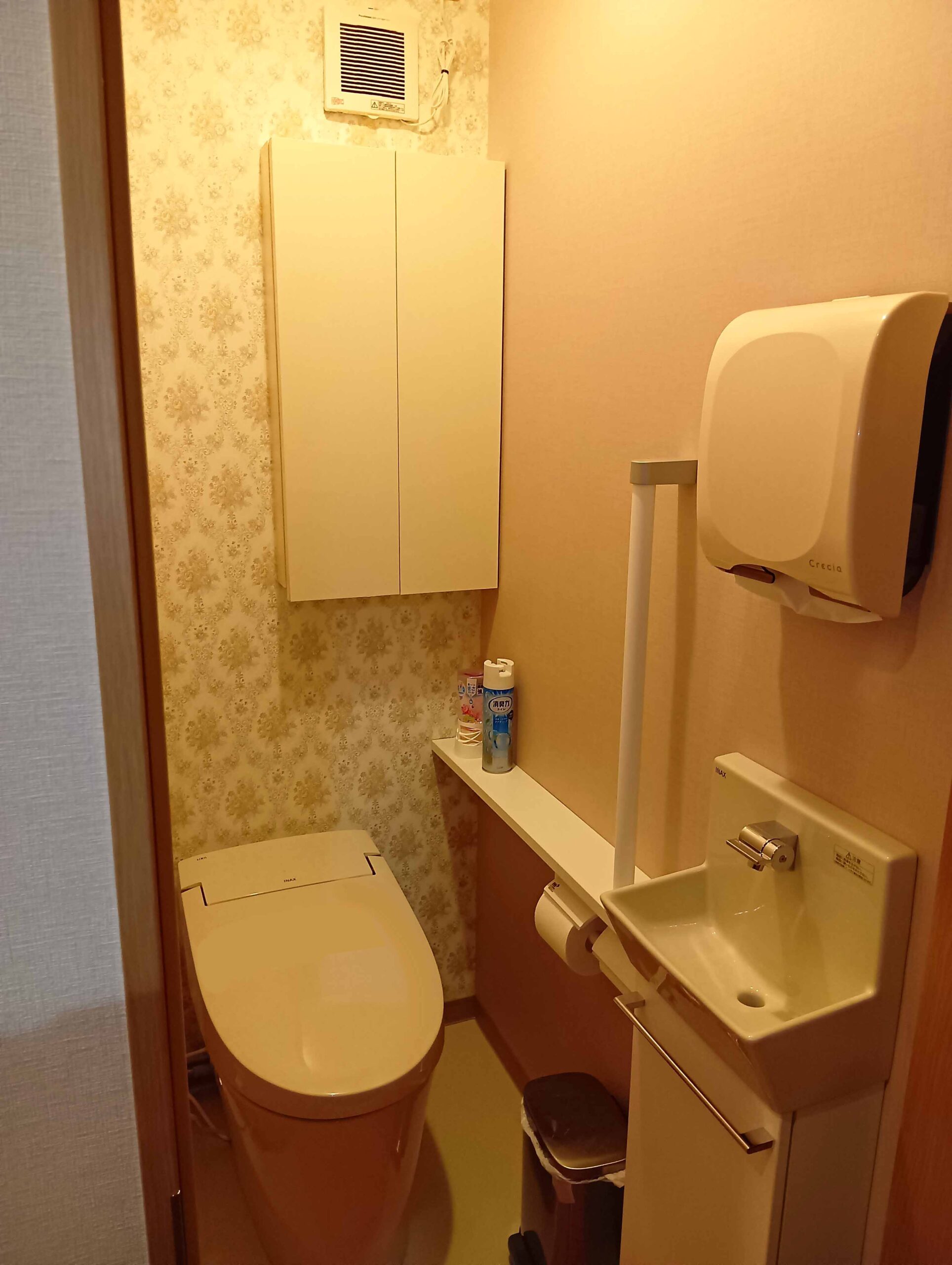 トイレ入口の間口が手洗い器を取付けるには少し狭いのでトイレ片開き扉を大きくし段差も解消しました。